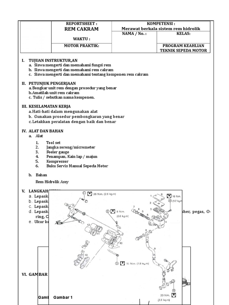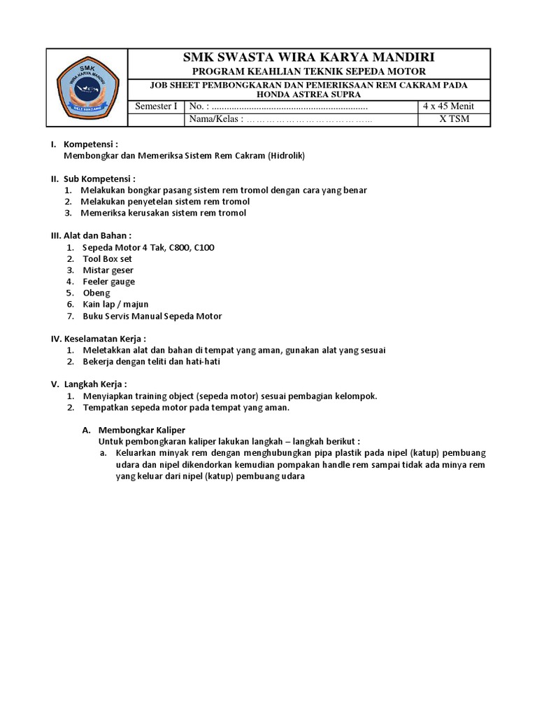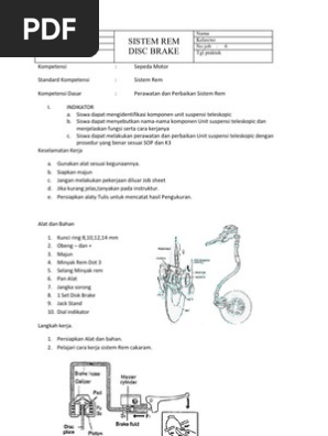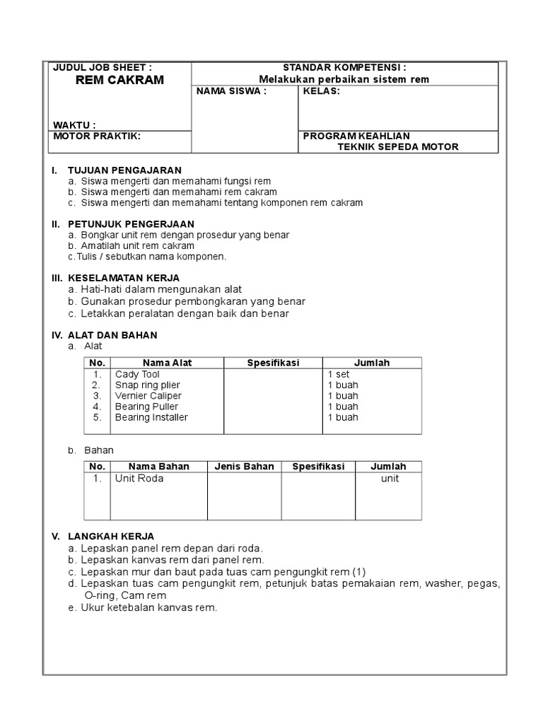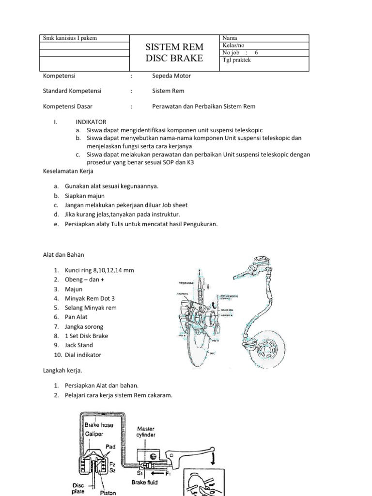 Jobsheet rem cakram sepeda motor. Karusel Sebelumnya Karusel Berikutnya. Modul Otomotif Servis Roda Ban Dan Rantai - Tsm Pak Kar 1 JOB SHEET KEPALA SILINDERdocx. Aki bekas dihargai 5-20rb.