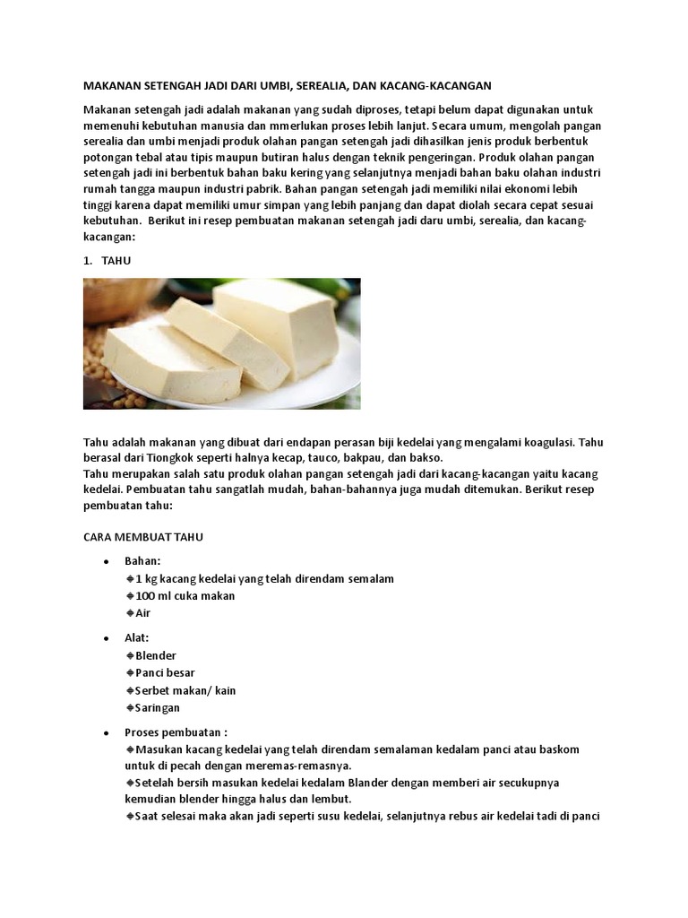 Resep makanan setengah jadi dari umbi. Berikut ini resep pembuatan makanan setengah jadi daru umbi serealia dan kacang-kacangan. Pembuatan makanan setengah jadi dari Serealia. Nah resep ini mungkin bisa jadi inspirasi Mama menyiapkan menu harian si kecil.